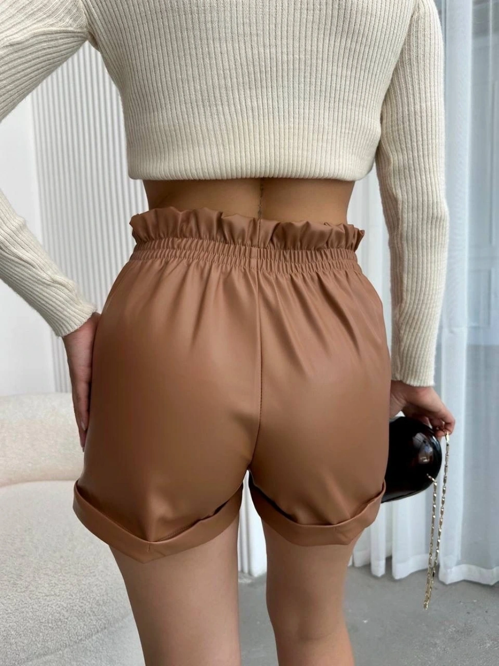 Şıklık ve rahatlık arayan kadınlar için ideal bir seçenek olan Beli Lastikli Deri Şort Kahve H24605, gardırobunuzun vazgeçilmez parçalarından biri olmaya aday!