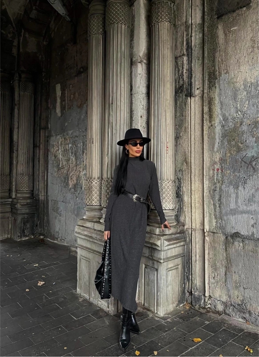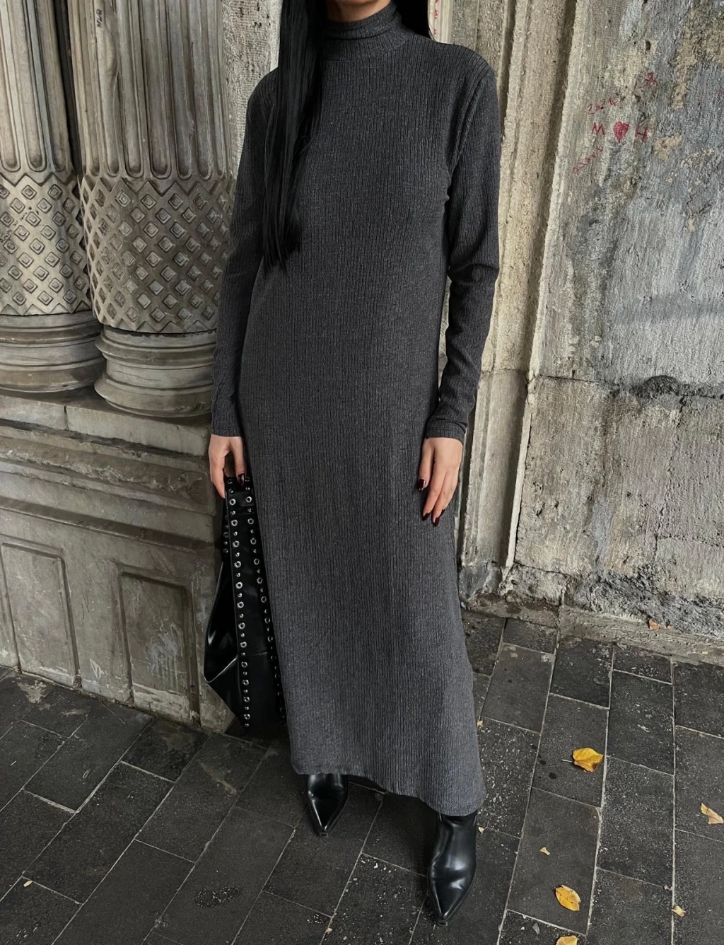 • Boğazlı kalın bürümcük uzun elbise siyah