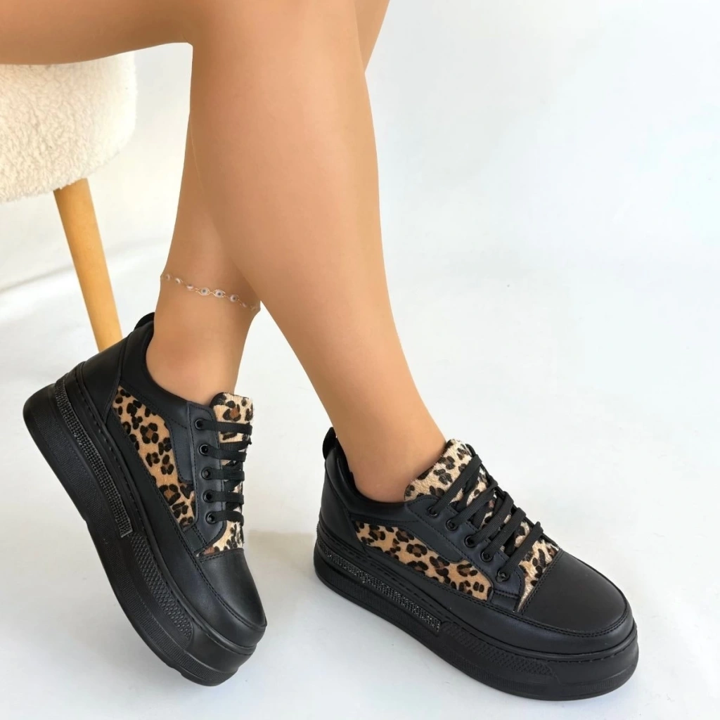 Lorrin Siyah Cilt Leopar Detaylı Bağcıklı Spor Ayakkabı