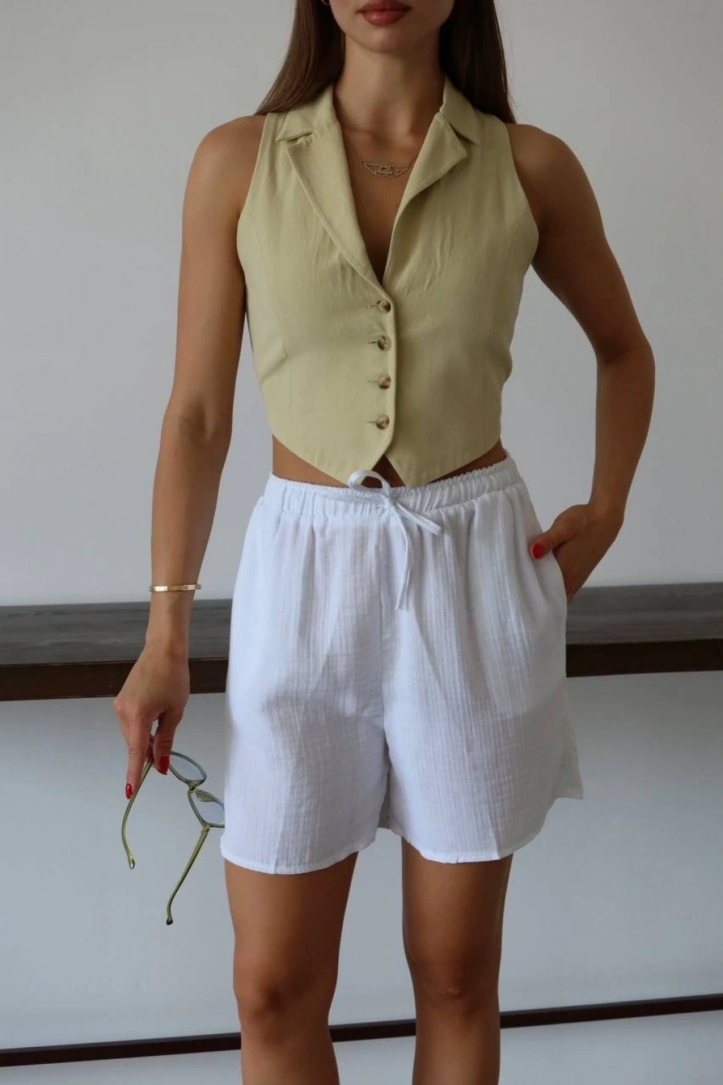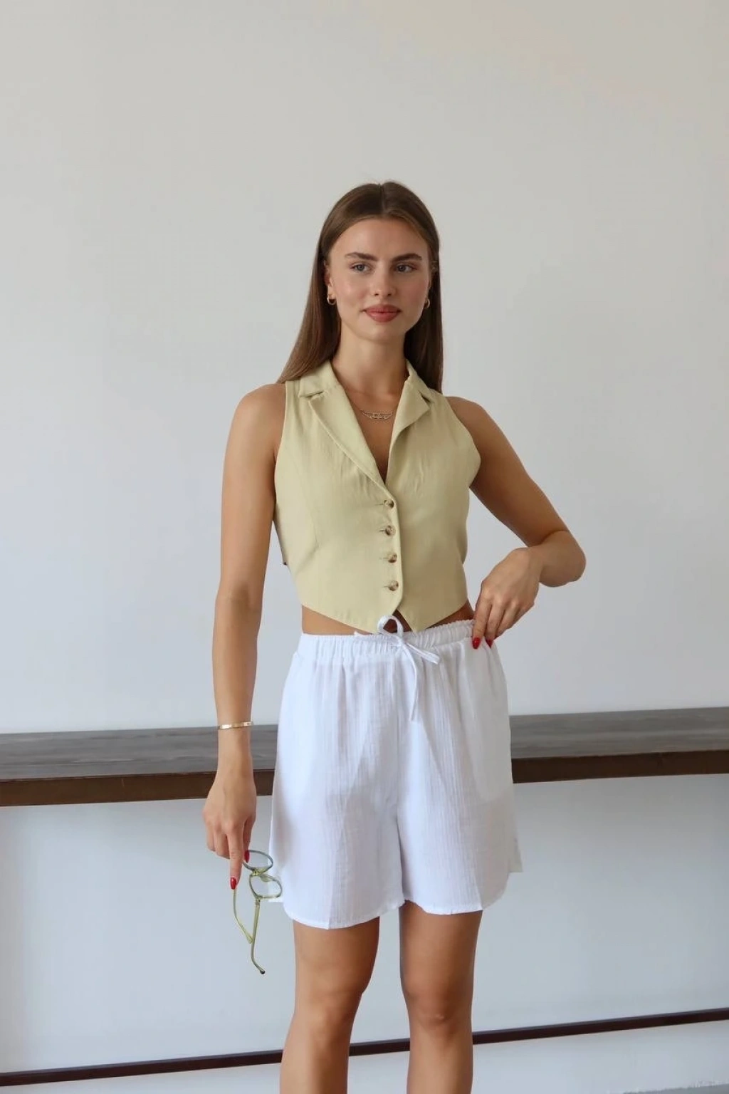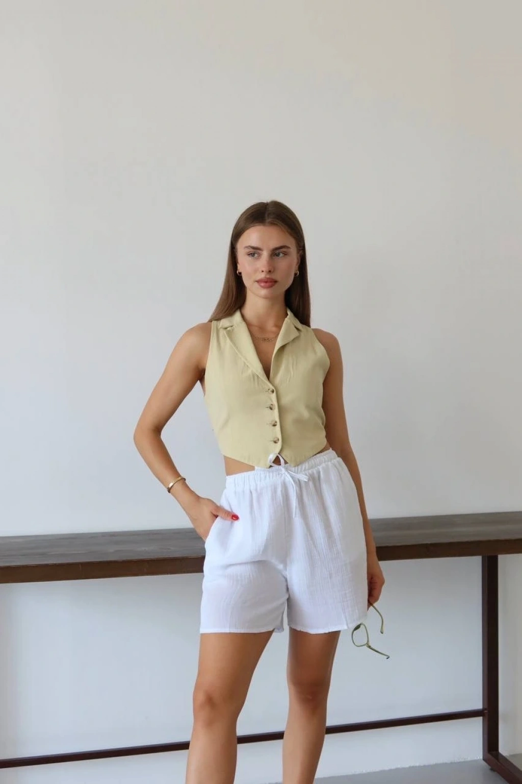 Kadınların yaz aylarında rahatlıkla tercih edebileceği şık ve şort modeli: Müslin kumaş şort bağcıklı beyaz PT!